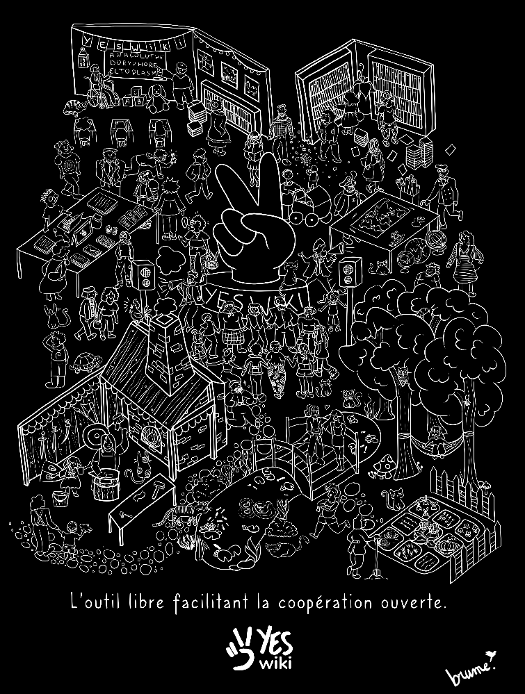 Salut la commu Yeswiki ! Nouveauté 2023, l'asso se dote d'un T-shirt représentant le foisonnement (le Bazar) de la communauté grâce à ce visuel monochrome réalisé par Brume (publié sous licence CC BY SA) :